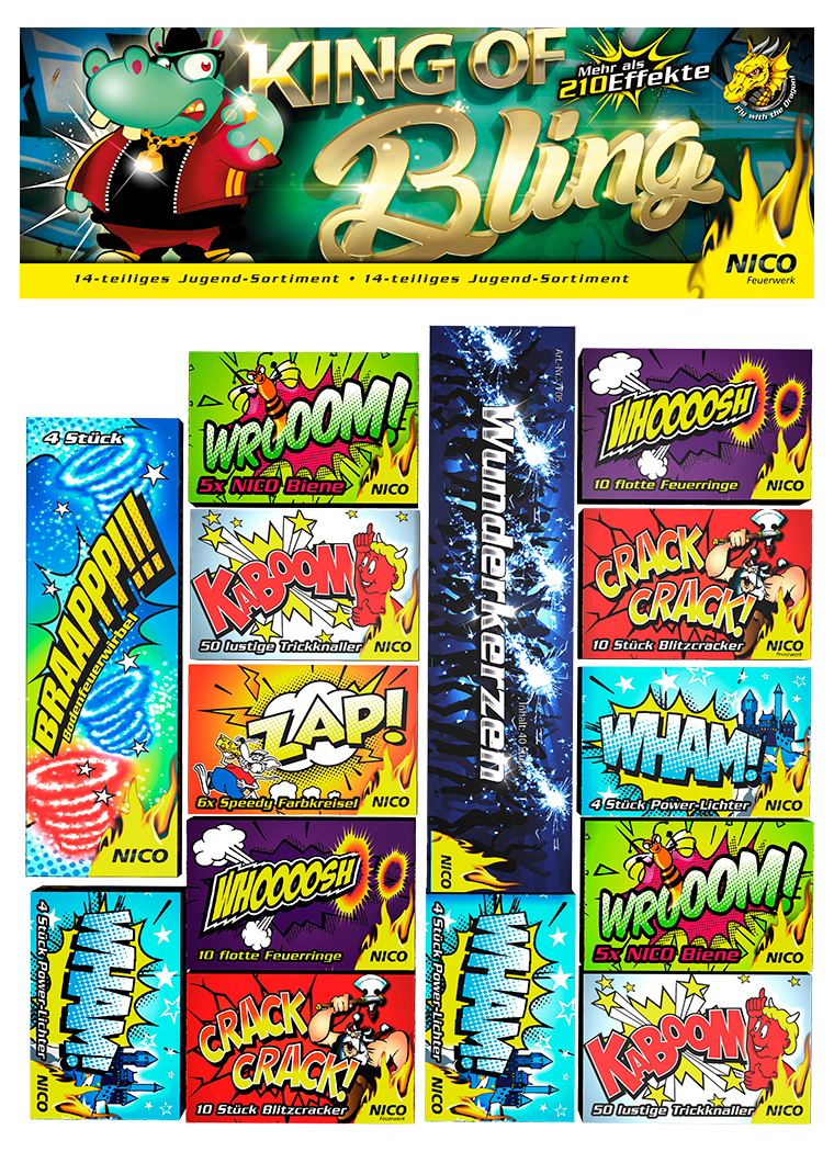 Das King of Bling Jugendsortiment von Nico stellt einen der größeren Verteter seiner Art dar. Mehr als 210 Einzeleffekte warten darauf von euch in 14 Schachteln gefunden und entzündet zu werden. Hervorzueheben sind die früher als Pyroette bekannten Bodenfeuerwirbeln.