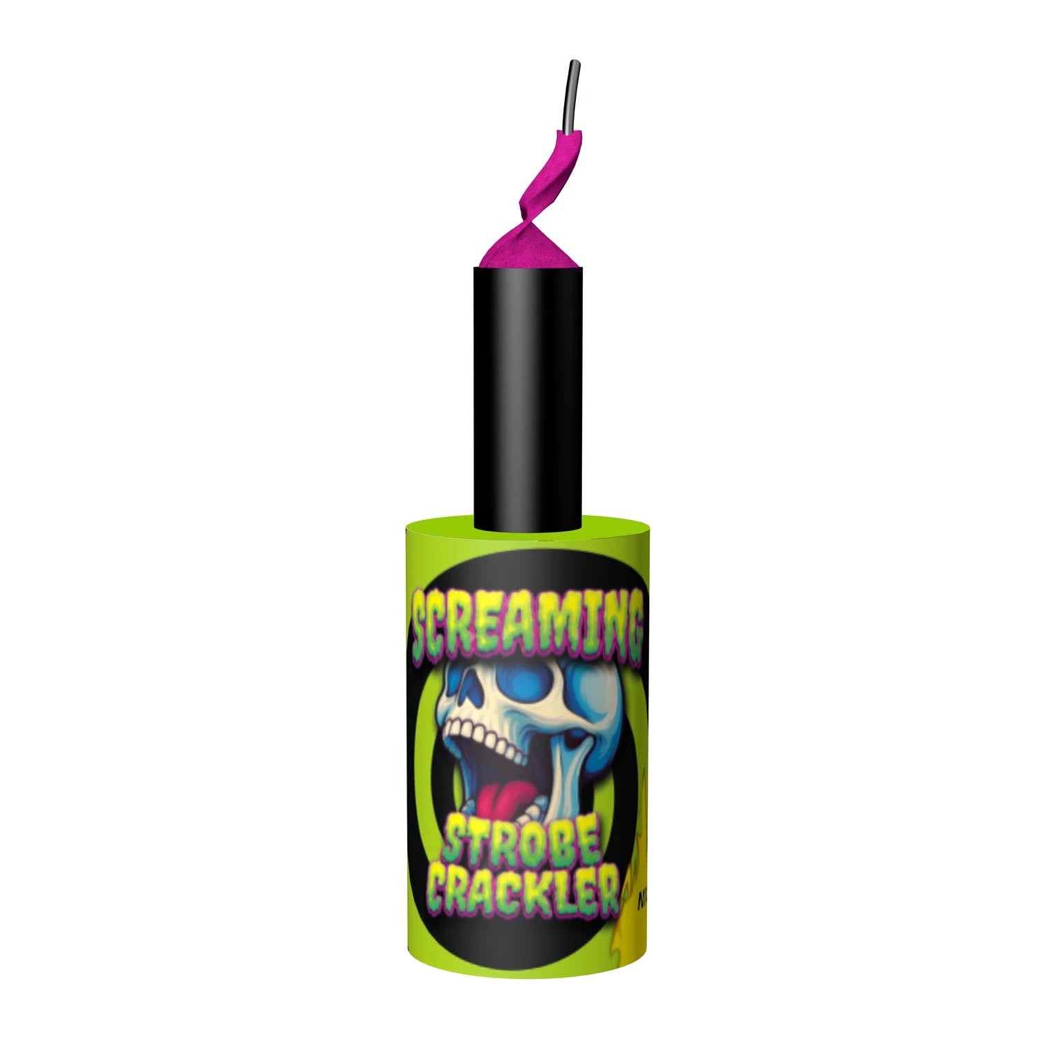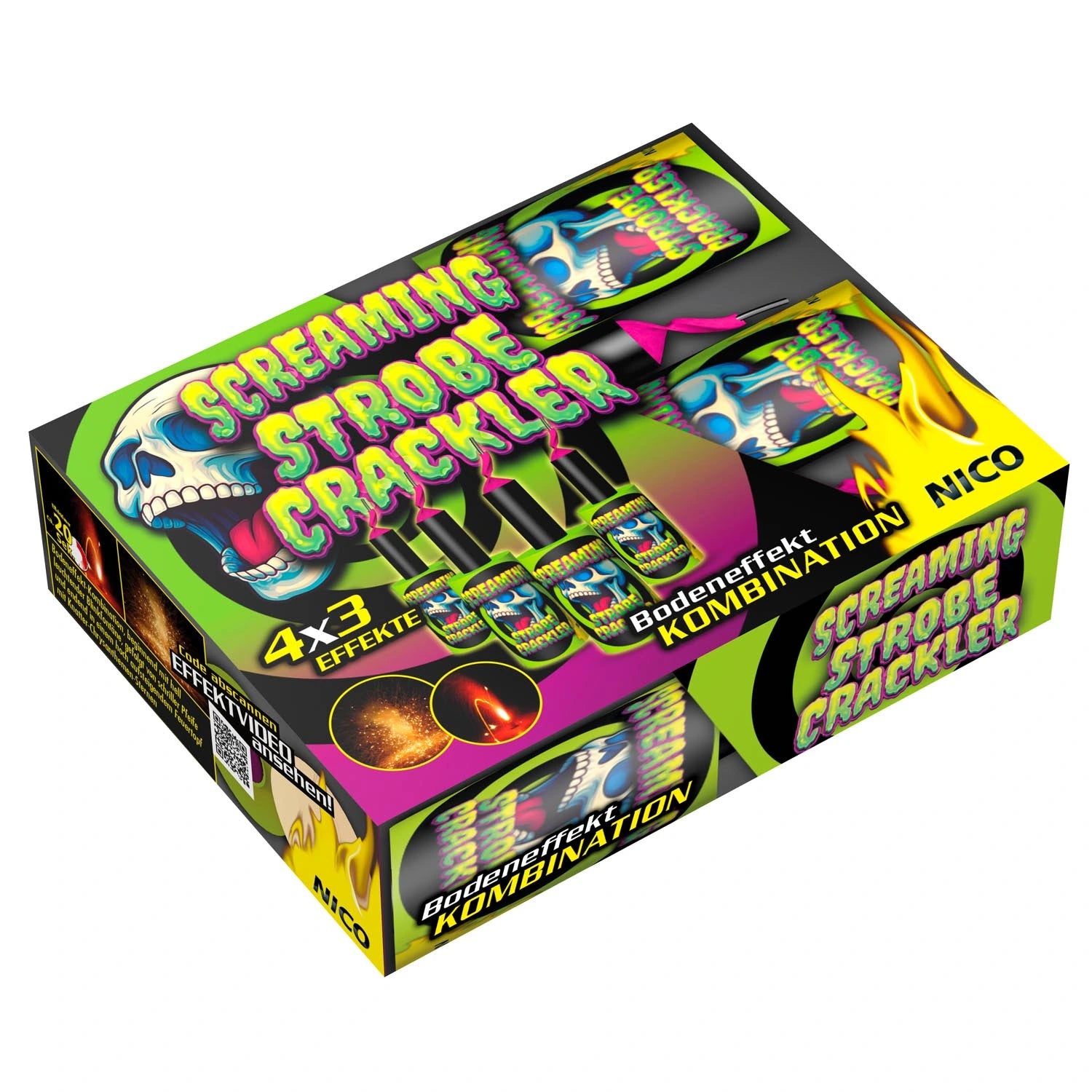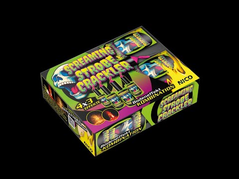 ... Nico Screaming Strobe Crackler...absolute Kaufempfehlung im Bereich Leuchtfeuerwerk/Crackling. Ich meine beginnen wir beim schicken Retrodesign der Verpackung die uns an ältere Horrorfilme erinnert...Gehen wir anschließend über das Design der einzelnen Screaming Strobe Crackler, die uns dezent an die Koboldfontänen vergangener Comet-Tage auf Pyrobolika erinnern...und enden bei dem Effekt...zuerst erhellt eine extrem lange Strobo-Blinker-Phase die Nacht...anschließend folgt der markante Pfeifton (Horrorfilm-mäßig eben)...und dann, wenn man denkt es wäre alles vorbei...BÄM mega fettes Crackling Inferno!