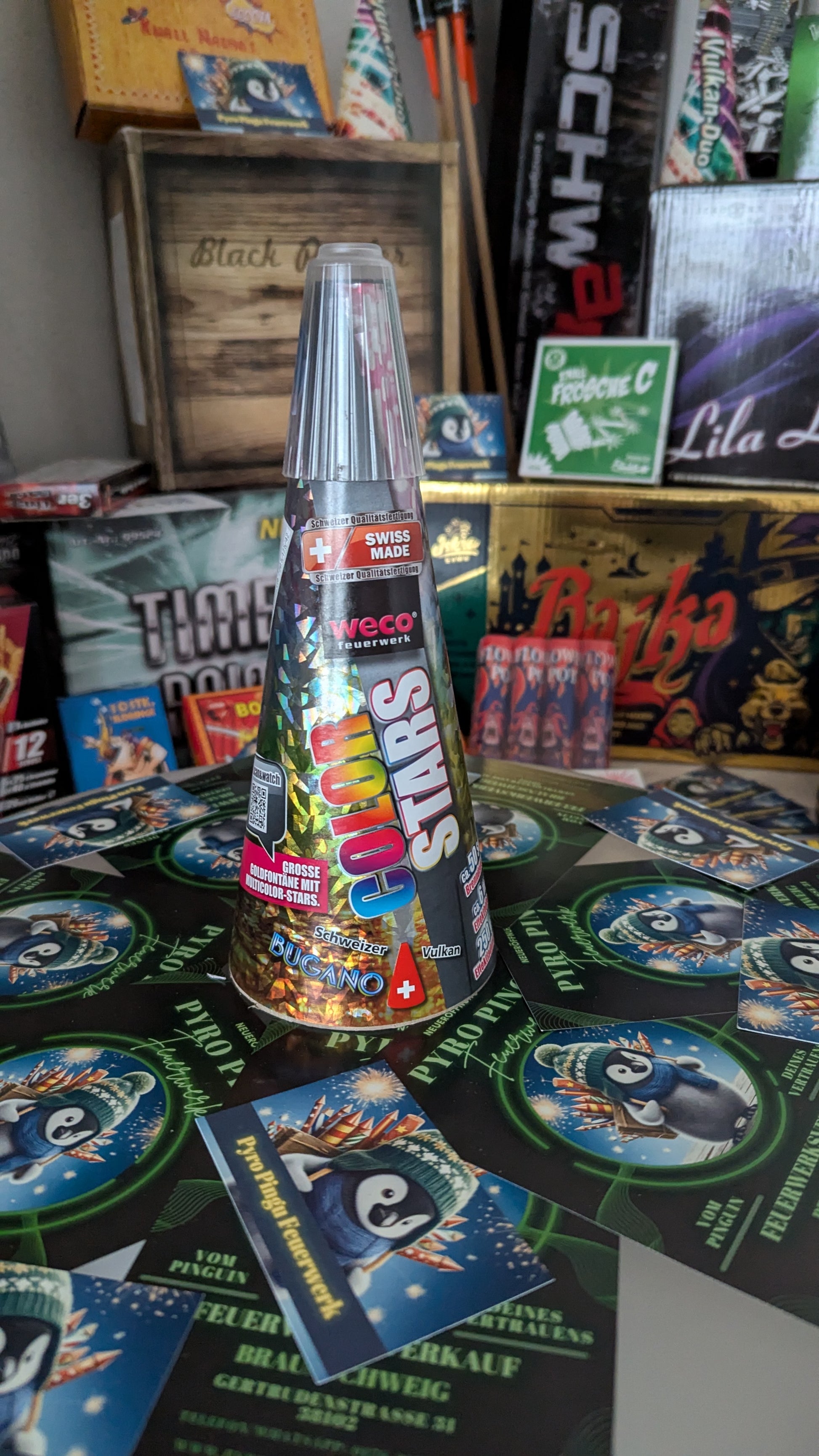 Wer große (250 Gramm) Vulkane sucht, stößt unweigerlich auf die Schweizer Bugano-Vulkane. Hier haben wir ein weiteres Modell, dass in Kooperation mit Weco hergestellt wird. Der Einhorn Pups Vulkan überzeugt mit einer langen Brenndauer von circa 50 Sekunden und der üblichen enormen Steighöhe von circa 6 Metern. Die mächtige Gold-Fontäne wird hier von bunten Farbsternen begletiet